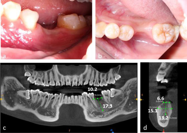 Cone-Beam Computed Tomography (CBCT) revealed a 4 mm vertical bone defect and an alveolar crest width of 6.6 mm at the edentulous site. The distance from the alveolar crest to the mandibular canal was 13.2 mm (Fig. 1c, 1d). The third molar (tooth 38) was mesioangularly impacted.