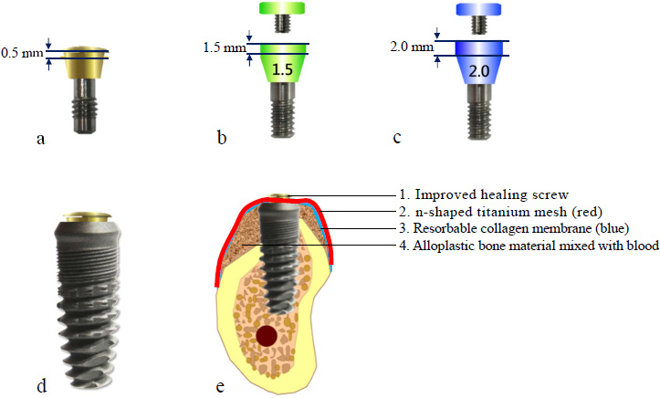 Design characteristics of modified healing abutments and titanium mesh application. (a) Modified healing abutment with 0.5 mm vertical height, (b) Modified healing abutment demonstrating 1.5 mm vertical dimension, (c) Modified healing abutment with 2.0 mm vertical profile, (d) Clinical application of 0.5 mm healing abutment in conjunction with dental implant, (e) Schematic representation of implant-supported tenting technique utilizing titanium mesh for guided bone regeneration.
