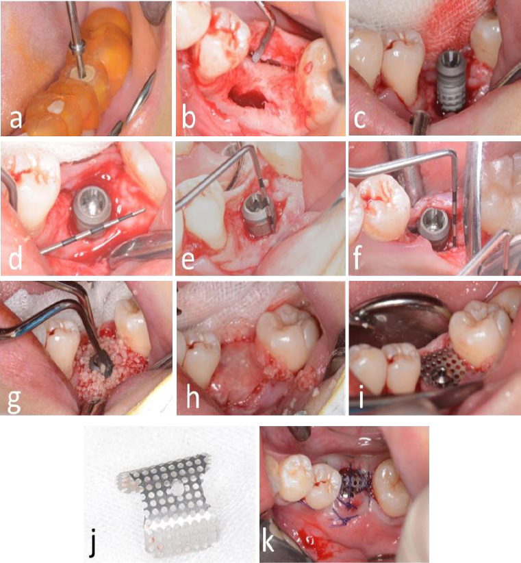 Surgical procedure for dental implant placement. (a) Positioning of the surgical guide template, (b) Reflection of a trapezoidal mucoperiosteal flap, (c) Osteotomy and implant placement, (d) Peri-implant bone defect at the cervical region, (e) Buccal vertical bone defect measuring 4 mm; (f) Lingual vertical bone defect measuring 2 mm, (g) Augmentation using alloplastic bone graft material, (h) Application of bioresorbable membrane to cover the graft site, (i) Fixation of titanium mesh using a 0.5 mm modified healing abutment, (j) Contouring of titanium mesh prior to placement, (k) Postoperative exposure of titanium mesh.