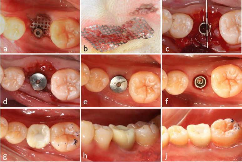Bone graft material was applied around the implant neck and the buccal alveolar bone defect. A bioresorbable membrane was then positioned to cover the osteogenesis area and perforated at the implant's using a probe. The titanium mesh was subsequently placed and secured onto the implant using a 0.5 mm modified healing abutment (Fig. 3g-i).