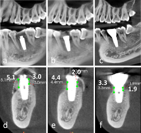 At the 2.5-year follow-up, the vertical bone height on the buccal side was maintained at 3.3 mm, while the lingual side measured 1.9 mm (Fig. 5c, 5f).