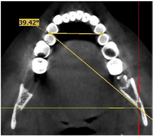 - MF–CLP angle: The coronal view was used to adjust the sagittal plane to the inferior border of MF; then, the axial plane was adjusted to match the level of and come into contact with the mandibular premolars. Afterwards, from the axial view, a straight line was drawn between the contact areas of premolars, and another line from the CLP contact area to the MF was created (Fig. 1).