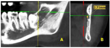 - MF height: In the sagittal view, the axial plane was adjusted on the buccal cusp tip of the mandibular first premolar and mesiobuccal cusp tip of the mandibular first molar (Fig. 2A), then from the coronal view, a line was drawn from the inferior border of MF to the axial plane (Fig. 2B).