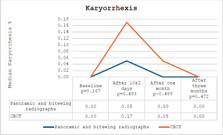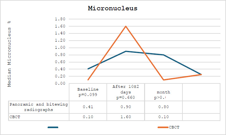 At the 10±2 days mark, an increase in micronuclei was observed in both groups, with no significant difference (p-value=0.660). However, after one month, the percentage of micronuclei was significantly lower in the CBCT group compared to the first group (p-values < 0.001). Cytotoxic alterations showed a comparable pattern, with transient increases in both groups that returned to baseline at three months.