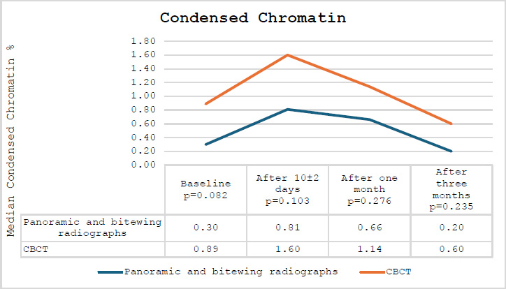 In relation to condensed chromatin and karyorrhexis, a comparable pattern was noted among the participating subjects: an increase after 10±2 days, succeeded by a decrease after one and three months. Overall, the percentages of participating subjects in the CBCT group exceeded those in the panoramic and bitewing radiographs group. The percentages of condensed chromatin and karyorrhexis among the participating subjects are presented in Figs. (2 and 3), respectively.