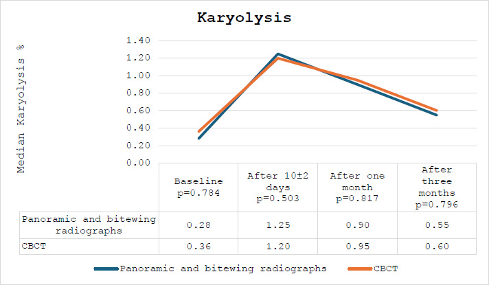 The percentage of karyolysis increased in both groups after 10±2 days, followed by a steady decline in both groups after one and three months. The percentage of karyolysis among the participating subjects is presented in Fig. (4).