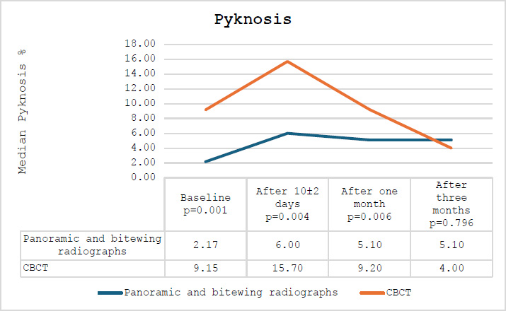 Finally, regarding pyknosis, the CBCT group exhibited significantly elevated levels after 10±2 days (p-values = 0.004) and after one month (p-values = 0.006) compared to the panorama and bitewing groups. After three months, the levels in both groups were comparable (p-values = 0.796). The percentage of pyknosis among the participating subjects is presented in Fig. (5).