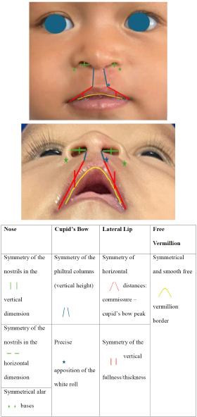 The nasolabial appearance was assessed using the UCL SOE scale. Four distinct anthropomorphic elements of the cleft lip repair—nose, Cupid’s bow, lateral lip, and free vermillion—were scored for symmetry using the scale (Fig. 2). A three-point scoring system was used for each element: 2 points for excellent, 1 for mild asymmetry, and 0 for unacceptable (Fig. 3) [11].