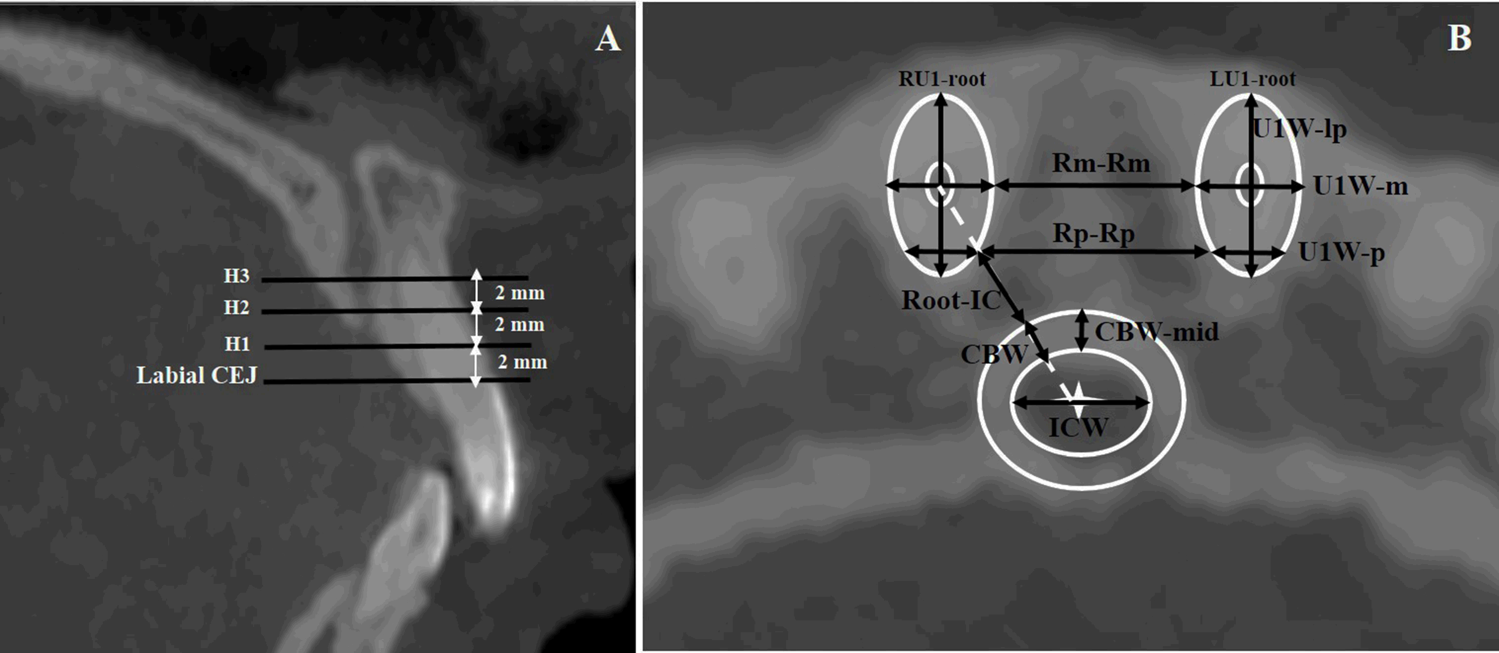 Three axial levels-H1 (2 mm), H2 (4 mm), and H3 (6 mm) above the labial cementoenamel junction of U1-were used to evaluate spatial relationships (Fig. 1A) [17, 19-21]. At each level, IC width (ICW) was measured as the maximum horizontal diameter through the radiolucent center (IC-Cen). The root-IC distance was defined as the shortest linear distance from the incisor root surface to the outer cortical border of the IC. Cortical bone width (CBW) was measured along the same axis from IC-Cen outward, and CBW-mid was assessed in the midsagittal slice (Fig. 1B).