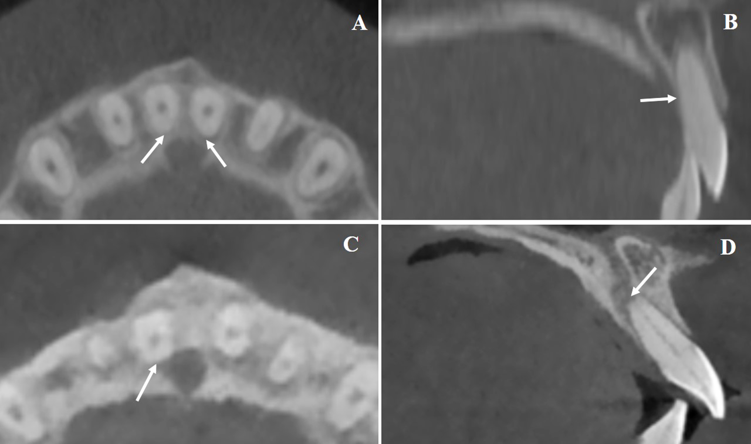 Representative Patterns of U1 Root and Incisive Canal Proximity. A and B. Representative CBCT images showing direct contact between the incisor root and the lateral wall of the incisive canal (highlighted by arrows). C and D. Examples illustrating root invasion into the IC lumen, with cortical disruption clearly visible (indicated by arrows).