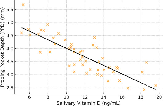 Scatter plot demonstrating the inverse association between salivary vitamin D levels and PPD (r = –0.45, p < 0.01).