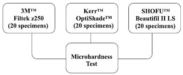 This in vitro study compared three resin composites bonded to sound coronal dentin on 12 non-carious molars using their corresponding bonding agent. The microtensile test was conducted with a universal testing system (Instron, Norwood, MA, USA). The microhardness test was conducted with a HMV series microhardness tester (Shimadzu, Kyoto, Japan). The experimental groups are shown in Figs. 1 and 2.