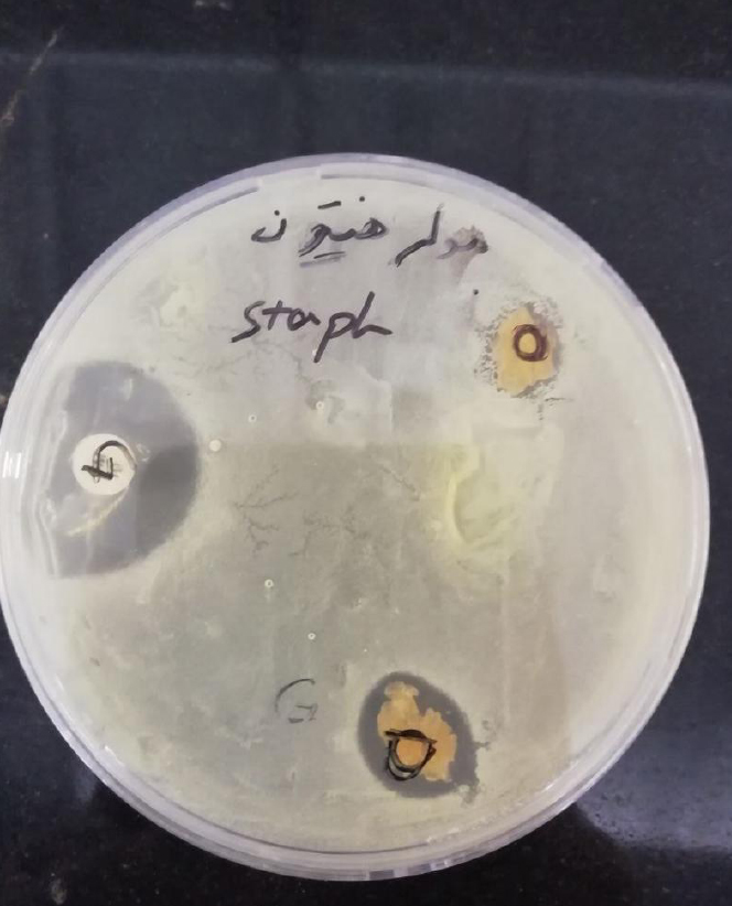 Antibacterial activity of Urtica dioica-loaded alginate hydrogels against Staphylococcus aureus on Mueller–Hinton agar. Clear inhibition zones are visible around the extract-loaded hydrogels, whereas blank samples exhibited no antibacterial effect. Gentamicin discs served as positive controls.
