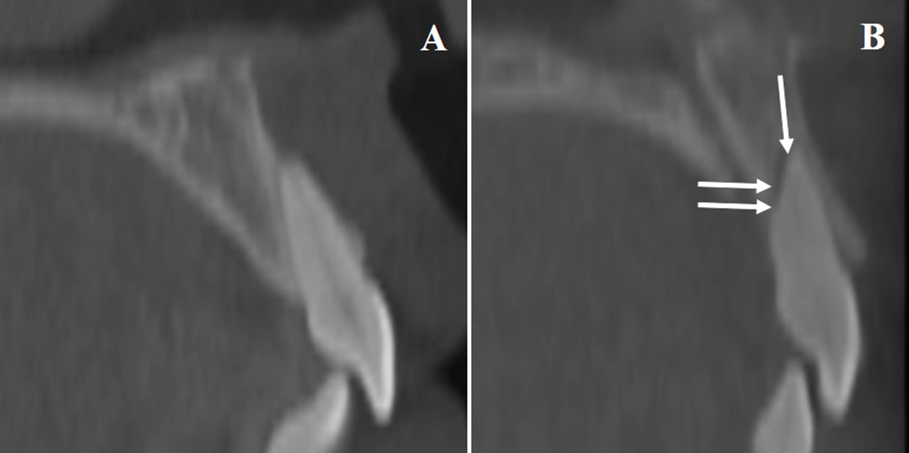 Illustration of Root Resorption in U1. A). Baseline CBCT image of a maxillary central incisor prior to treatment. B). Post-treatment scan revealing evidence of apical and horizontal root resorption (arrows mark the affected zones).