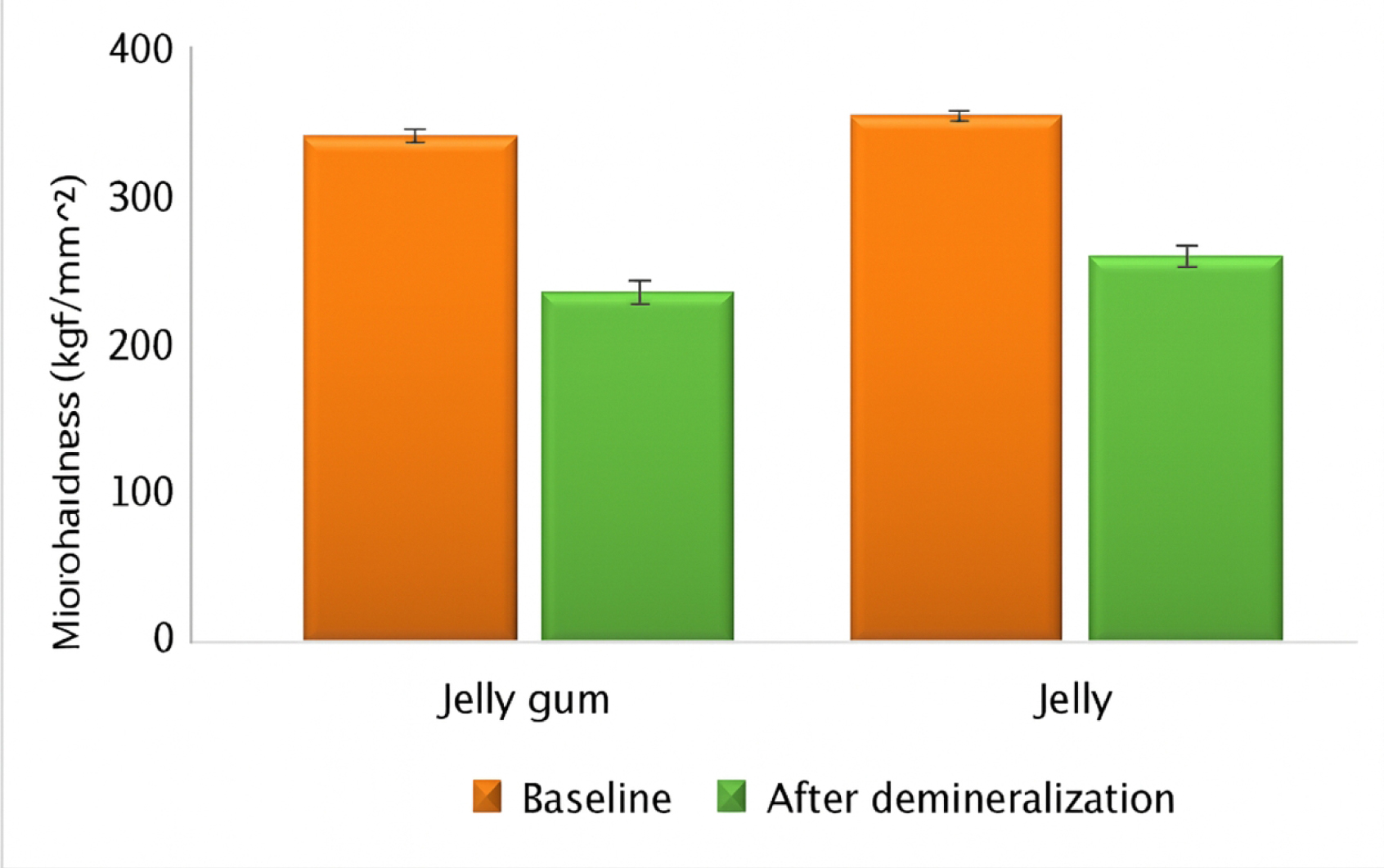 Y-axis: microhardness (kg/mm2). X-axis: treatment group (jelly vs. jelly gum). Error bars represent standard deviation (SD).