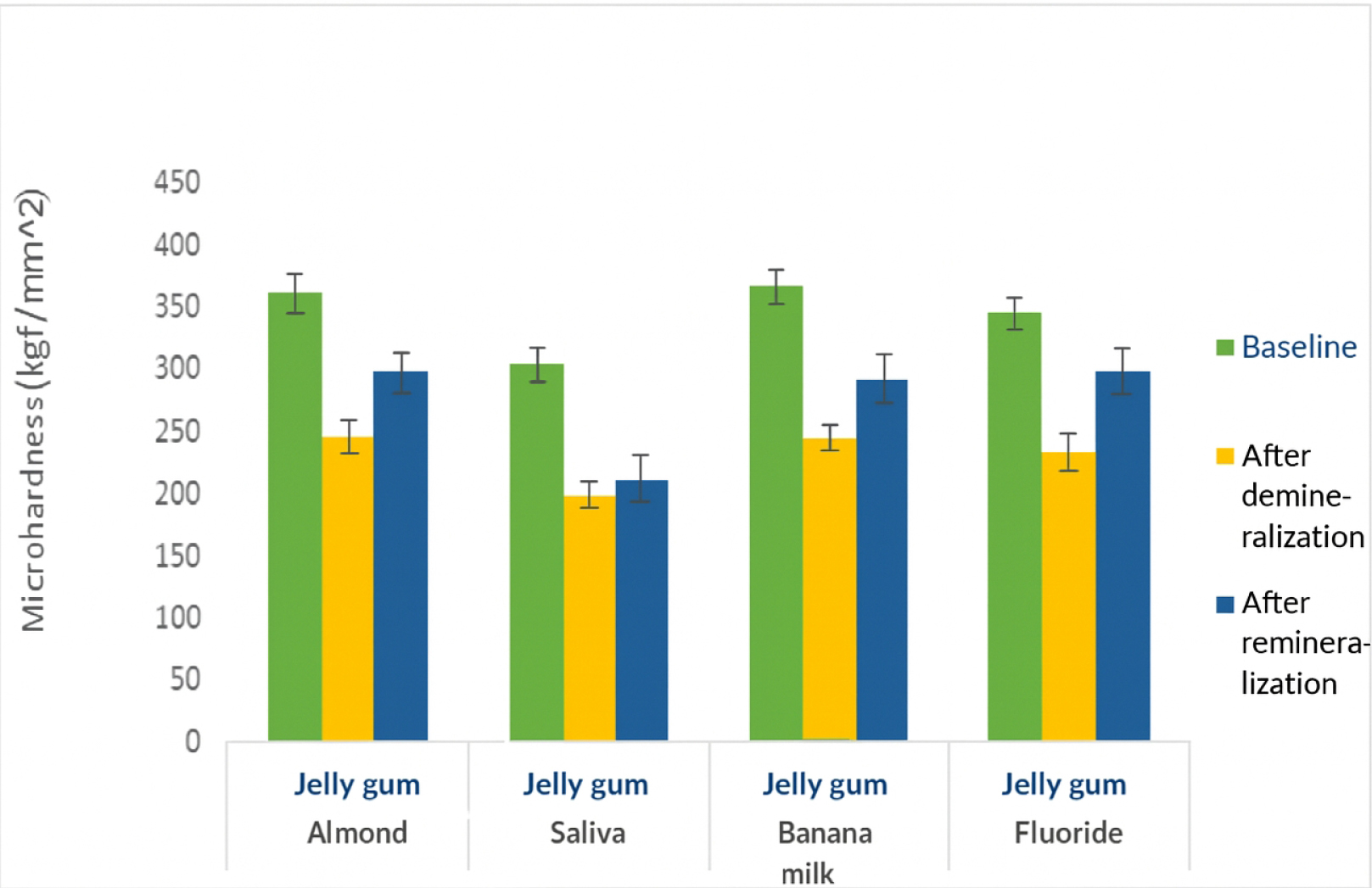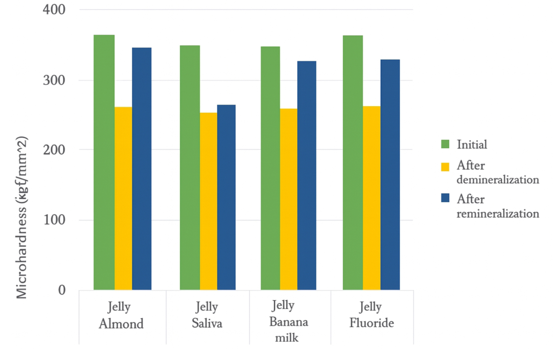 This in vitro study was conducted on 80 primary molar teeth. After the initial microhardness measurement, half of the teeth were immersed in an edible jelly solution, while the other half were immersed in a jelly gum solution for 5 minutes twice a day for 5 days. At the end of the fifth day, the microhardness of the samples was measured again. The teeth in each group were then randomly divided into four subgroups (n = 10) for immersion in 80% almond suspension, banana milk, artificial saliva, and fluoride gel for 15 minutes. Next, the microhardness of the teeth was measured for the third time, and the results were analyzed using ANOVA, ANCOVA, and post-hoc tests (α = 0.05).