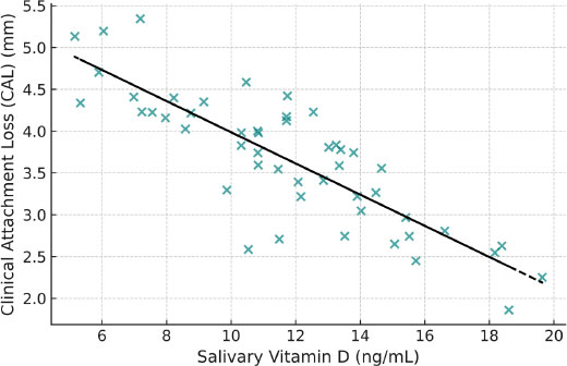 Scatter plot showing the inverse correlation between salivary vitamin D levels and CAL. A moderate negative trend is evident (r = –0.50, p < 0.01).