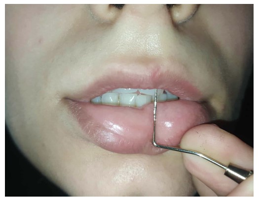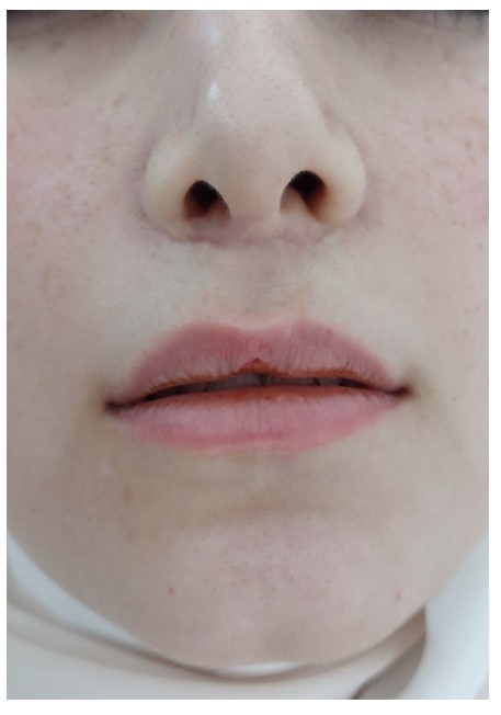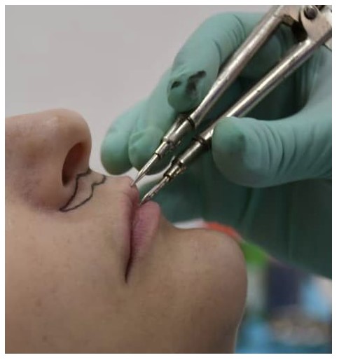 Upper lip height: Upper lip height was estimated by measuring the distance between the inferior vermilion border and the vermilion border at rest using a fine ruler (Fig).