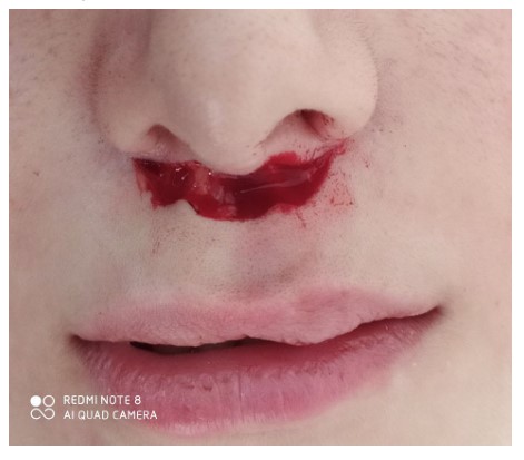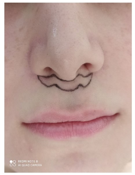 Local anesthesia was administered using a 1:100,000 solution of lidocaine with epinephrine to minimize bleeding and ensure effective numbing (Fig. 1). Once adequate anesthesia was achieved, the surgeon carefully marked the incision line using a sterile surgical pen. A modified bullhorn design was employed, which allows for better distribution of tensile forces and helps conceal the scar within the natural creases beneath the nose (Fig. 2).