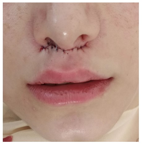 The outer skin layer was closed using 6/0 nylon sutures using an interrupted suturing technique to ensure precise apposition and minimal scarring (Fig. 4). Particular attention was paid to the mid-arch intersection during suturing, as accuracy in this area is essential for maintaining lip symmetry. At the conclusion of the procedure, a light dressing and antibiotic ointment were applied directly over the incision site.