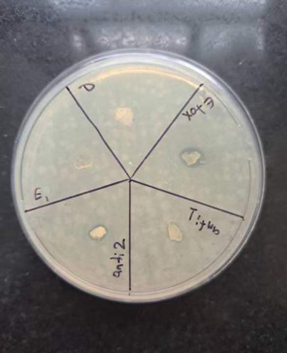 Antibacterial activity of different Urtica dioica-loaded alginate hydrogel formulations against Escherichia coli on Mueller–Hinton agar. Distinct inhibition zones are observed around extract-loaded hydrogels, while blank hydrogels show no inhibition. Each labeled section represents a different test formulation.