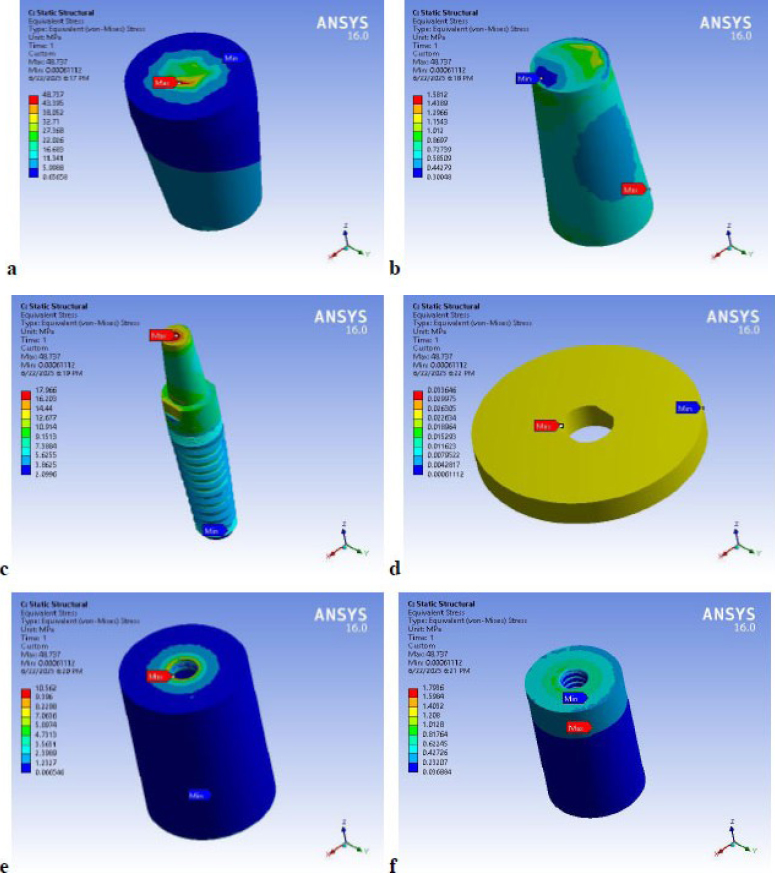 Sample of von Mises stress distribution on the model components “Lithium disilicate crown” under vertical load; (a) crown, (b) cement layer, (c) implant complex, (d) gingival, (e) cortical bone, (f) spongy bone.