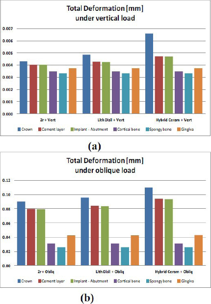 Three crown materials tested were Multilayered Zirconia (MZ, Lithium Disilicate, and Polymer-infiltrated Hybrid Ceramic. As presented in Fig. (4a,b), respectively, under both vertical and oblique loading, Multilayered Zirconia “MZ” crowns consistently exhibited the lowest deformations. Lithium Disilicate crowns showed intermediate deformation, while Polymer-infiltrated Hybrid Ceramic crowns demonstrated the highest deformation. This indicates that zirconia provides the most rigid and stable superstructure among the tested materials. A significant finding was that oblique loading produced approximately 20 times the deformation of vertical loading. Despite this increase, the overall deformation values were described as 'fairly small' and did not suggest a critical condition or failure.