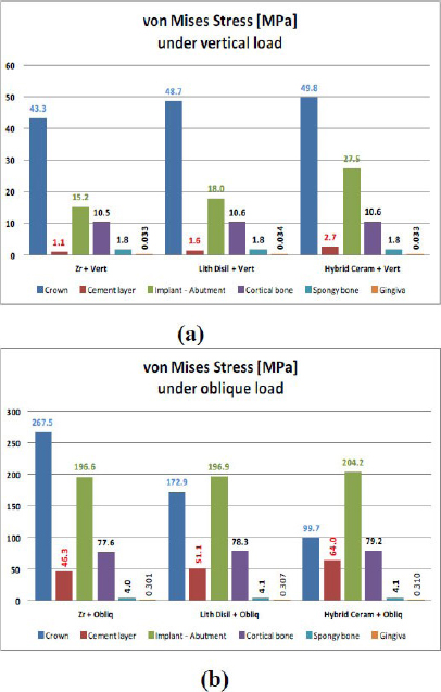This underscores the importance of accounting for non-axial oblique loads in dental implant design and material selection. Vertical loads exert less stress, (Fig. 5a), and Oblique loading exerted stress higher than vertical loading on all model components, (Fig. 5b) (crown materials, cement layer, implant-abutment, cortical bone, spongy bone, and gingiva) by approximately 5-10 times more.