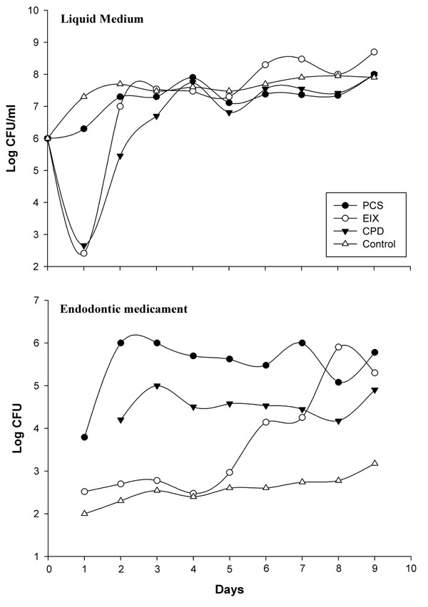 Growth curves of E. faecalis in medium and in each endodontic medicament reported for shake culture over nine day; each point represents the arithmetic mean of three determinations. The viable cells were expressed as colony-forming units in ml per liquid medium and in CFU/entire medicament surface (19.6 mm2).