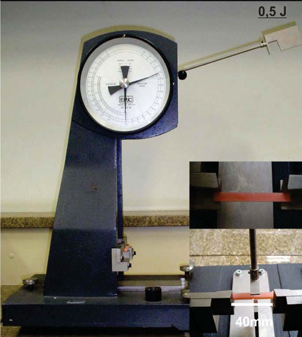 The impact strength was evaluated using plastic impact test machine (AIC - EMIC, São José dos Pinhais, Paraná, Brazil) using the Charpy method with a pendulum of 0.5J, in which the specimens were horizontally positioned, with a distance of 40 mm between the 2 fixed supports (Fig. 1B).