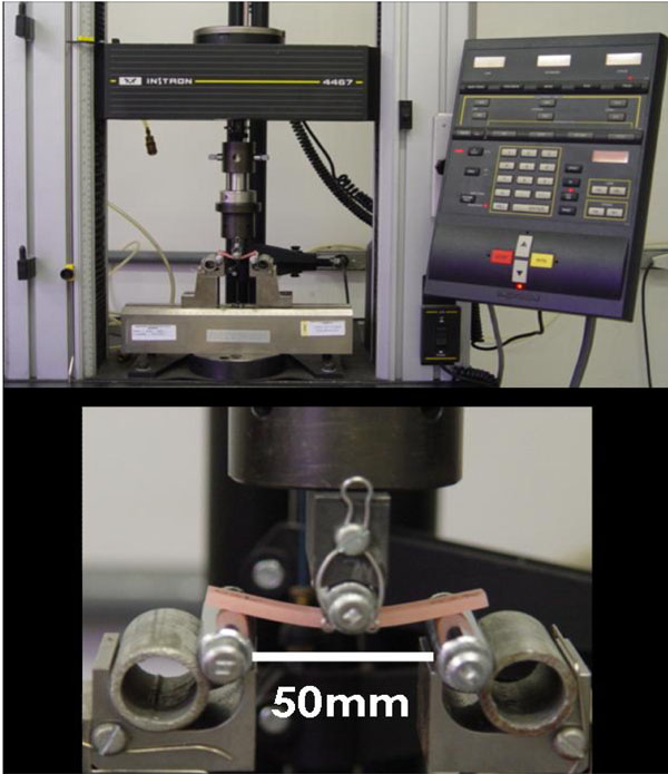 Flexural strength test was performed by the 3-point bending test using a universal testing machine (Instron Model 4467, Instron Industrial Products, PA, USA) calibrated with a 500kgf load cell and a crosshead speed of 5mm/min. The flexural testing device consisted of a central loading plunger and 2 polished cylindrical supports, 3.2 mm in diameter and 10.5 mm long. The distance between the centers of the supports was 50mm. The compressive force was applied perpendicular to the center of the specimens until a deviation of the load-deflection curve and the fracture of specimen occurred (Fig. 2). The stress at yield, Young modulus and displacement at yield of the specimens were recorded and the stress-displacement graph was evaluated.