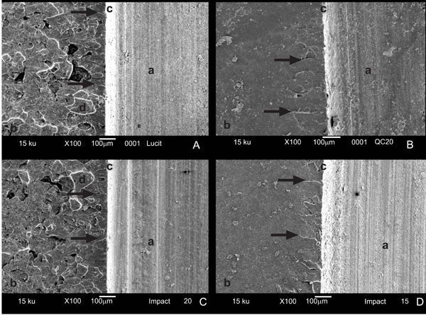 The effects of the impact fracture process on the acrylic resin microstructures observed in the SEM-photomicrographs showed a true network polymer structure with the presence of homogeneous particles for Lucitone 550 and Impact 2000 resins (Fig. 4A-C) while QC20 and Impact 1500, showed a smooth and flat microstructure with some disoriented striations (Fig. 4B-D).