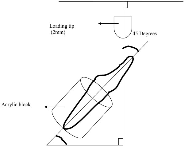 A static load was applied to the restored teeth with a universal testing machine (model LRX, Lloyd Instruments Ltd, Fareham, UK) at a speed of 1.0 mm/min. The acrylic block containing the restored tooth was tightly fixed to the inclined metal base to provide a 45-degree angle between the palatal surface of the tooth and the loading tip (spherical Ø 2.0 mm) (Fig. 2). The loading event was registered until fracture for each tooth and the failure mode for each specimen was visually analyzed and categorized to 2 typical types of failures: favorable type above the CEJ which has easy possibility to repair (portion of the core fractured, or failure occurred at core-tooth interface) and unfavorable type below the CEJ (vertical root fracture) with difficult chance to repair.