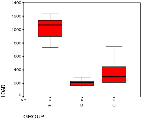 Mean values of load-bearing capacity (N) of test specimens. Horizontal line above the boxes indicates groups that do not differ statistically from each other.