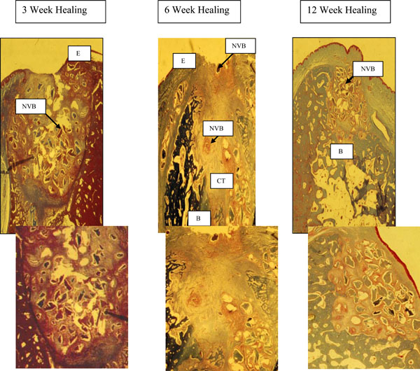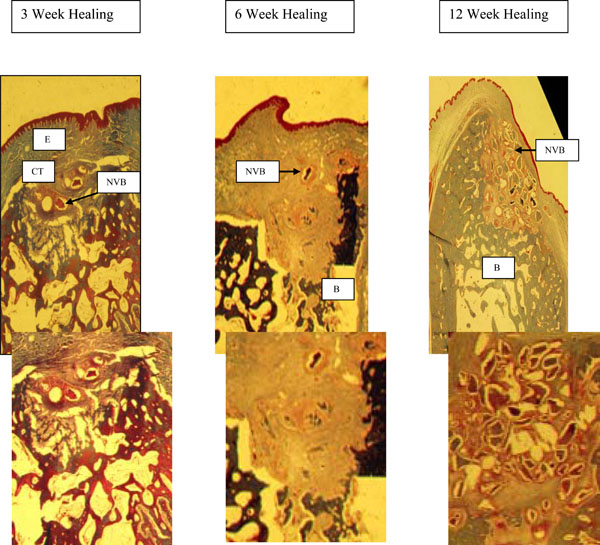 3. 12 weeks - maxillary sites had complete fill of the socket with new bone and only a few bone chips were seen in the overlying connective tissue. In mandibular sites (above section – omit this reference to an above section), new bone filled most of the socket, but in the coronal third there was a cone shaped area of non-vital bone particles, surrounded by inflammatory infiltrate and connective tissue. This cone was narrow in the center of the socket becoming wider in the coronal portion of the area.
