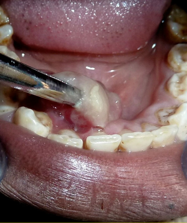A 14-year-old black boy was attended, through a collaborative program supported by a not-for-profit program, at Dental & Oral Department in Soweto General Hospital –Arusha - (Tanzania). The chief complaint was a growing mass on the floor of the mouth for more than one year, which increased in size in the last weeks (Fig. 1). The lesion was asymptomatic although its considerable size had a potential to affect speech, mastication and even displacement of the neighbouring teeth. The patient referred a previous toothpick traumatic injury where the lesion appeared. There was neither past dental nor medical history of note.
