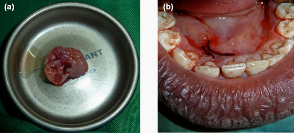 A conservative surgical excision of the lesion was planned. After local anaesthesia, the pedunculated mass was completely excised through the base of the lesion. A careful management of the lesion was performed while preserving the mucogingival complex. The underlying tissue was curetted to prevent recurrence of the lesion before suturing. Antibiotics and analgesics were prescribed for one week. After the excision of this pedunculated mass, a light and asymptomatic tumefaction was clearly evidenced on the right sublingual area probably related with the compressive effect on the right salivary duct (Fig. 3a, b). This swelling disappeared in a week after surgery.