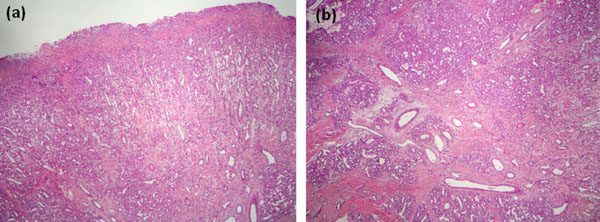 Microscopic appearance. Under an ulcerated surface there is an extensive granulation tissue reaction characterized by abundant small size vessels arranged perpendicularly to surface. At the bottom of the image, the characteristic appearance of pyogenic granuloma can be seen on the right (H&E, original magnification 10x).
