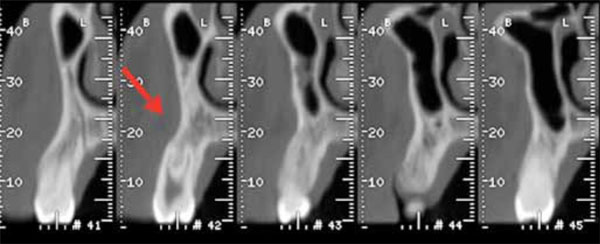 TC cross-section scans showing a mild depression in the vestibular plate (cupping) of the left premolar maxillary alveolar process.