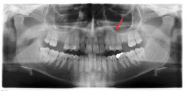 Ortopantomograph, thirty months after surgery, showing the intact bone in the left premolar maxillary area.