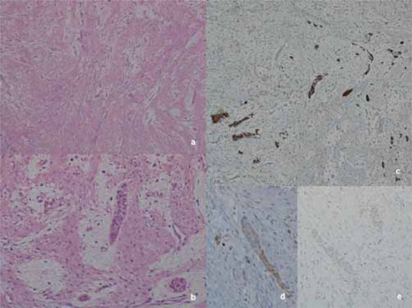 Histological low magnification shows dense spindle cells proliferation arranged in intersecting fascicles with scattered, isolated, thin, epithelial islands (a, Hematoxilyn-Eosin, 20x). High magnification emphasizes the epithelial neoplastic cells enveloped in a ring of mixoid substance inbetween the desmoplastic fascicles (b, Hematoxilyn-Eosin, 100x). Immunohistochemical staining for CKAE1/AE3 highlights the epithelial neoplastic strands compressed by the abundant collagen fibers (c, Hematoxilyn counterstain, 40x), while Bcl- 2 and CK 19 (d - e, Hematoxilyn counterstain, 100x): positive results in the epithelial neoplastic cells are rare, and very weak.