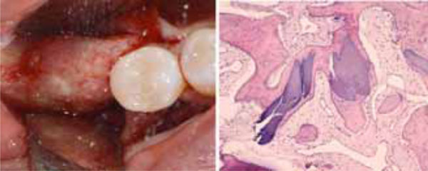 The histologic results appear to correlate with the good clinical outcome documented by the intraoral x-rays. Indeed all follow-up controls showed complete maintenance of the peri-implant bone levels without any sign of bone resorption. The healed bone was perfectly stable up to 24 months after bone augmentation, supporting the functional loading of the implant. A possible explanation of the maintenance of bone levels and stability over time is the nearly complete resorption and substitution of the heterologous biomaterial by newly formed functional bone tissue together with the restoration of the masticatory load. The fact that control x-rays maintained the same appearance over time, showing the first implant threads in strict contact with a bone-like area, as far as both structure and radio-opacity are concerned, also suggests that the heterologous bone material may have undergone a remodeling process leading to the osseointegration of the fixture also in the biomaterial-only grafted region.
