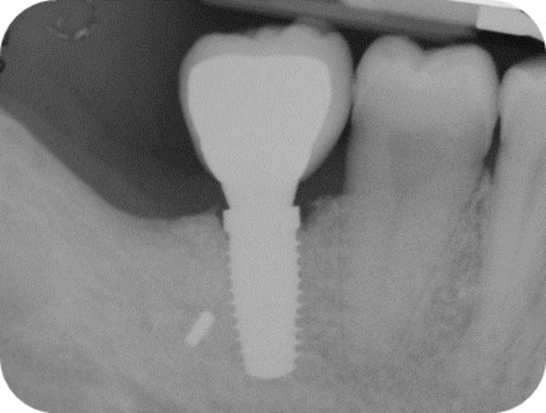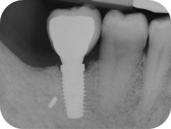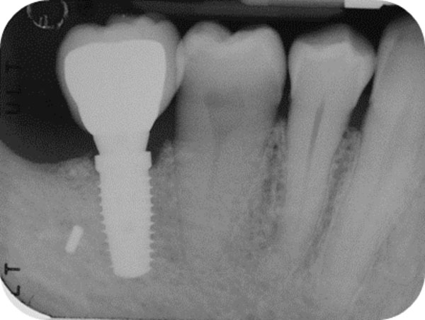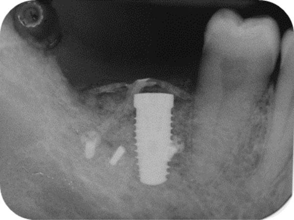 Post-surgical endoral x-ray showing the correct implant positioning and bone defect restoration.