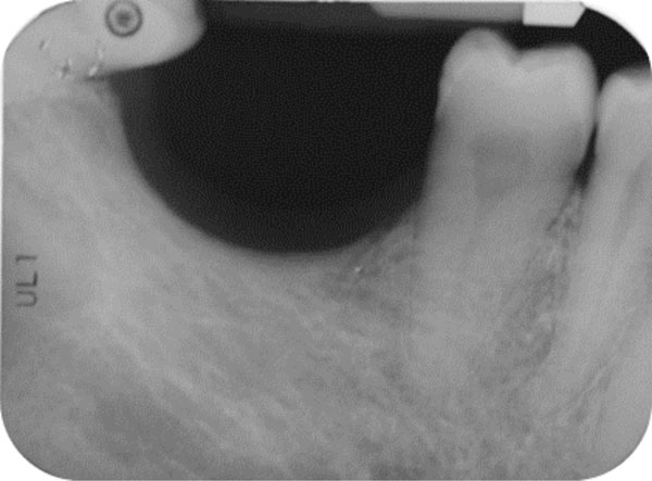 Endoral radiograph. The corresponding alveolar ridge shows a severe vertical atrophy.