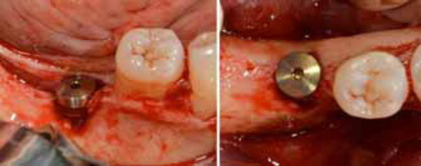 The patient healed uneventfully, with no clinical signs of soft-tissue inflammation or recession and, as recommended in the GBR protocol, no membrane exposure. At the time of the second-stage surgery, the implant appeared completely submerged in bony tissue. No graft volume appeared to have been lost during the healing period. Implant stability was checked with a reverse-torque test at 25 Ncm.