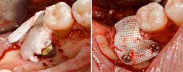 Positioning of the high density d-PTFE titaniumreinforced membrane to cover the grafted site. Heterologous porcine- derived biomaterial positioned to fill the peri-implant defect and to support the membrane (a); note the series of holes on the vestibular surface performed to induce bleeding and trigger bone regeneration. Definitive membrane fixing (b).