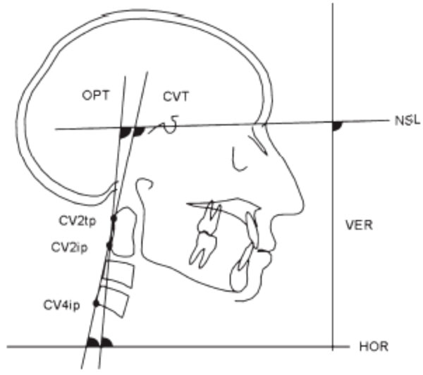 Craniocervical angulations used in the study of Mc Guinness at al. [14] OPT/NSL: the angle formed by the line tangent to the odontoid process (CV2tp) through cv2ip (the most inferior and posterior point on the corpus of the second cervical vertebra), and the nasion–sella line. CVT/NSL: the angle formed by the line tangent to the odontoid process through cv4ip (the most inferior and posterior point on the fourth cervical vertebra), and the nasion-sella line. OPT/CVT: the angle between the odontoid process tangent through cv2ip and the tangent to the odontoid process through cv4ip. NSL/VER: the angle between the nasion–sella line and true vertical. OPT/HOR: the angle between the line OPT and true horizontal. CVT/HOR: the angle between the line CVT and true horizontal.