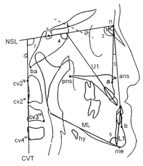 Craniocervical angulations used in the study of Kilinc et al [17]. Reference points and angular measurements. Reference points (Linder-Aronson, 1970): Hyoid (hy), the most postero-superior point on the body of the second cervical vertebra (cv2); cv2tg, the most postero-inferior point on the body of cv2; cv2ip, the most postero-inferior point on the body of cv2; cv4ip, the most antero-inferior point on the body of the fourth cervical vertebra (cv4ia); ad2, the intersection between a line from posterior nasal spine (pns) to the midpoint of a line joining basion (ba) and sella (s) and the posterior contour of the adenoid soft tissue shadow; ad1, the intersection between a line from pns to ba and the posterior contour of the adenoid soft tissue shadow; APW, the anterior pharyngeal wall along the line intersecting cv2ia and hy; PPW, the posterior pharyngeal wall along the line intersecting cv2ia;and hy; APW, the anterior pharyngeal wall along the line intersecting cv4ia and hy PPW, the posterior pharyngeal wall along the line intersecting cv4ia and hy. Angular measurements: 1-SNA, 2-SNB, 3-ANB, 4-U1 to NSL, 5-L1 to ML, 6-NSL/ML, 7-NSL/CVT; NSL, nasion sella line; ML, mandibular plane; NSL-CVT, the angle between line NSL and the line from cv4ipto cv2ip(cervical vertebra tangent).