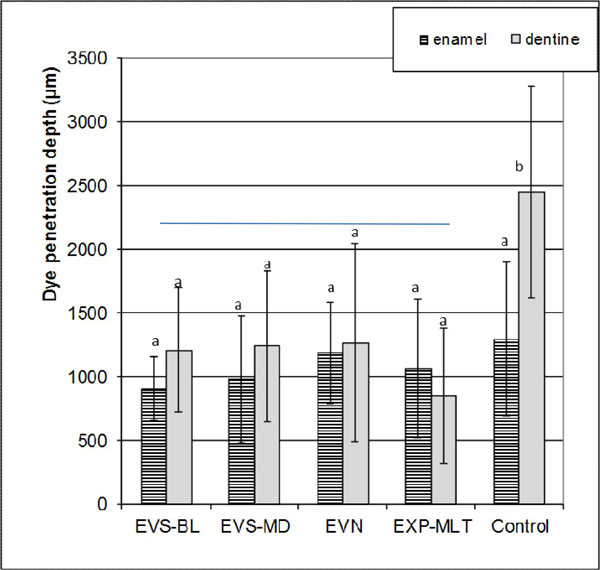 Mean stain depth (µm) and standard deviations in enamel and dentin. Vertical lines represent standard deviations. For abbreviations, see Fig. (1).
