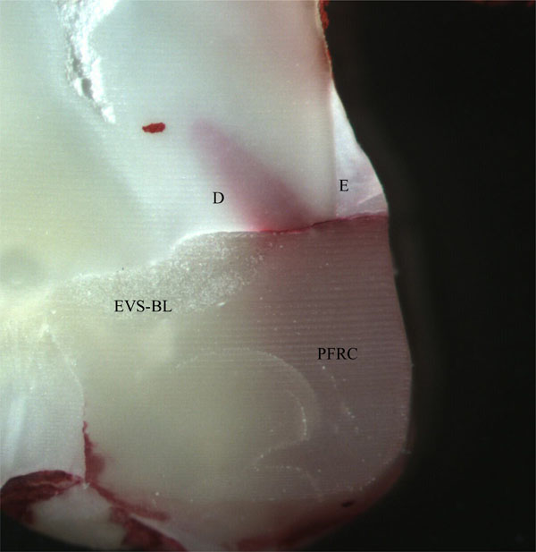 The representative tooth sections with unidirectional EVS-BL GFRC at the interface. D: corresponds for dentin. E: refers to enamel For abbreviations refer to Fig. (1).